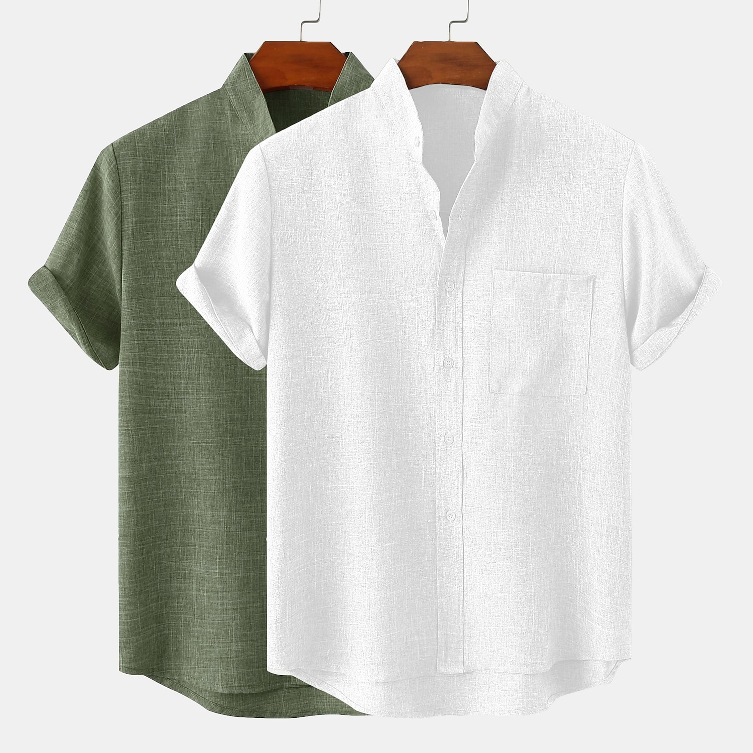 2Pcs Men's Linen Shirt Summer Shirt Beach Wear Casual Shirt Band Collar Shirt Plain Vacation Casual White+Yellow Pink+Yellow White+Green Gray+Pink Short Sleeve Mandarin Collar Summer Spring & Summer